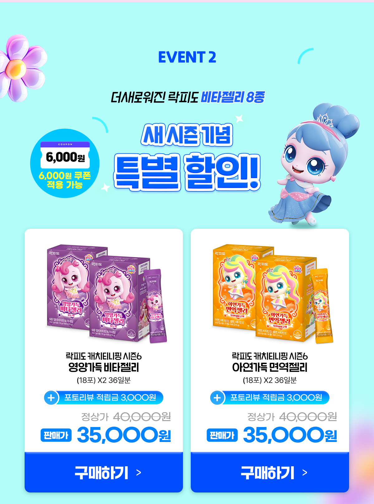 [3월 이벤트] 락피도 캐치티니핑 시즌6 영양가득 비타젤리 (15 g×18포)X2 /36일분 + 포토리뷰 작성시 적립금 3,000원 적립 (4월 4주차/ID당1회)