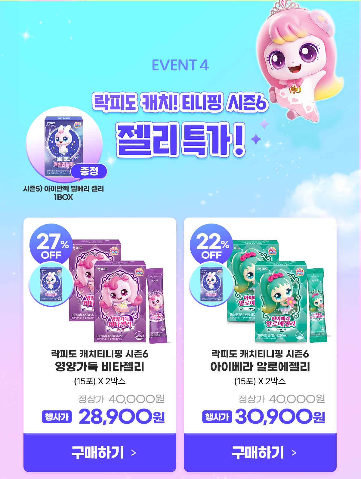 [락피도 온가족 기획전] 락피도 캐치티니핑 시즌6 아이베라 알로에젤리 (15 g×18포)X2 /36일분 + 아이반짝 빌베리젤리 1개 증정