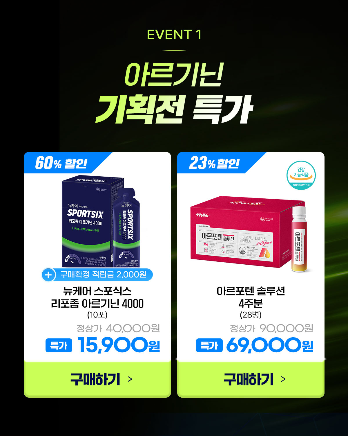 뉴케어 스포식스 아르기닌 부스터 6000 (24gX10포) + 크레아틴 퓨어 3000 (300g) / 소비기한 : 26.09.10